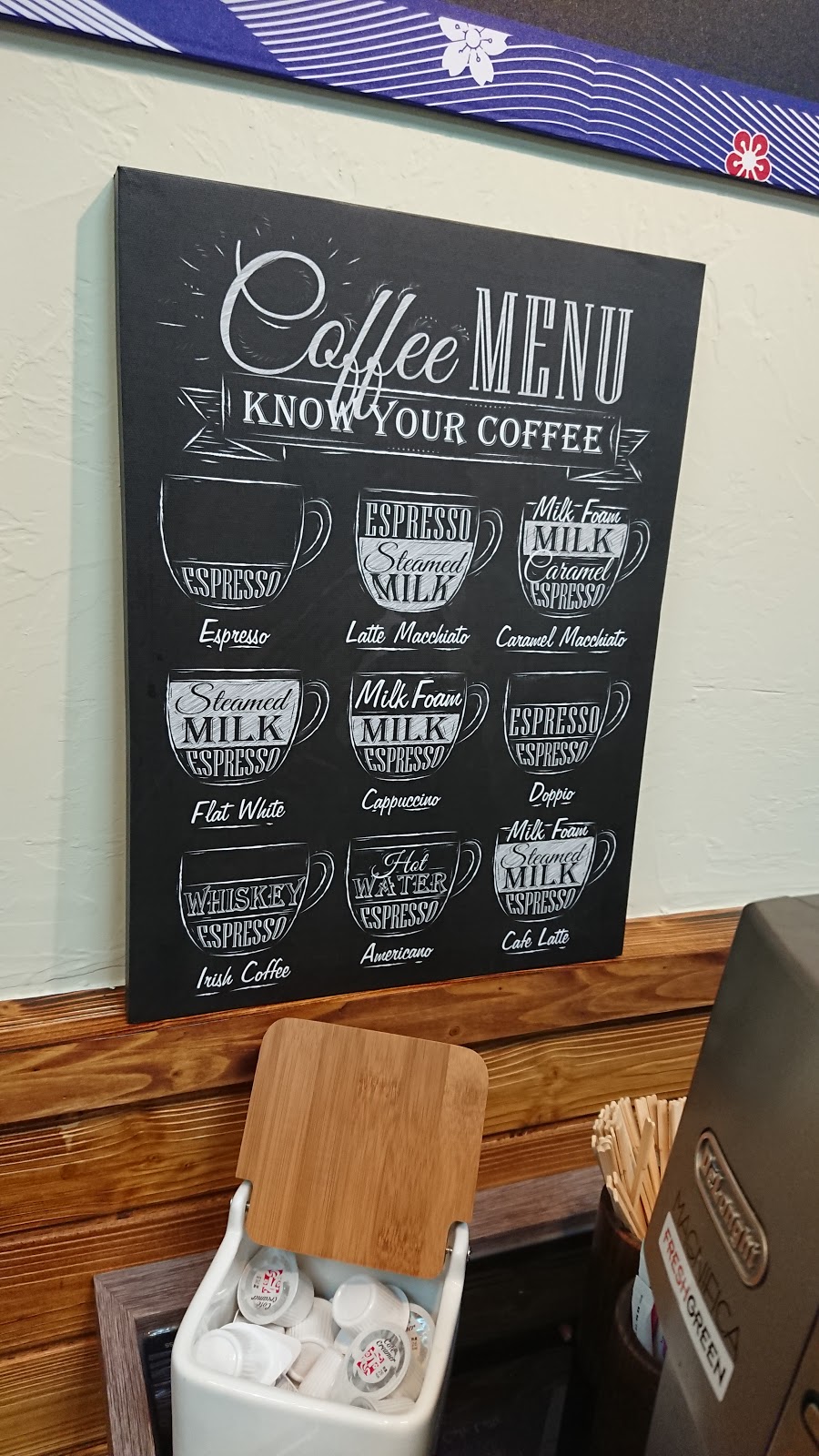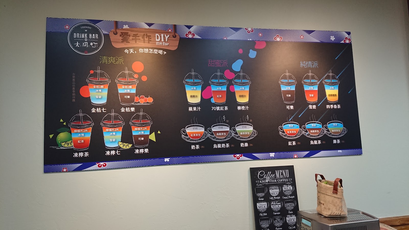 只要內用,飲料都是免費的,很多種選擇,汽水、咖啡都有,還有蝶豆花可以自己把飲料染漸層,牆壁上也有建議的搭配。