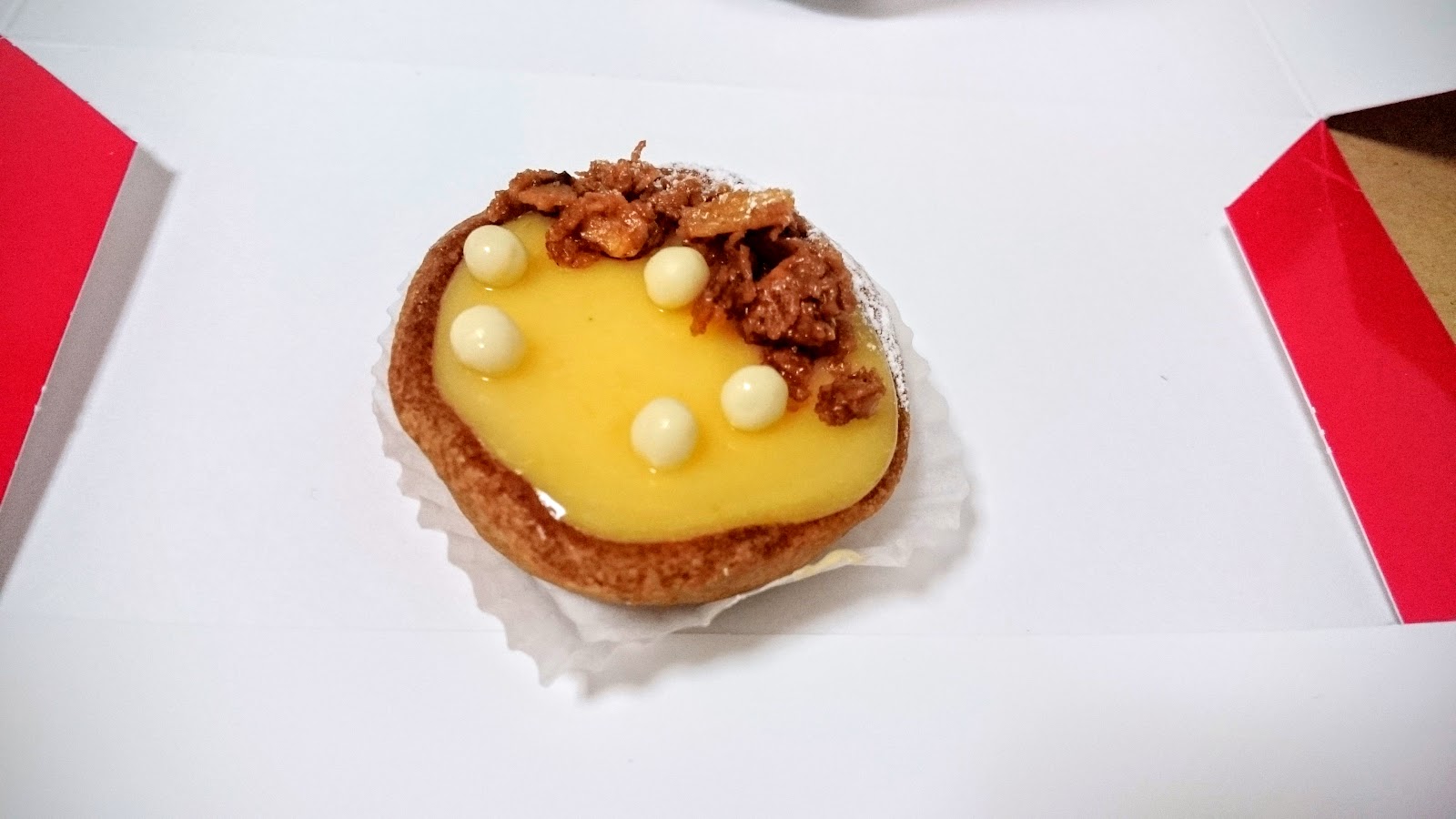 也是檸檬塔,下面是偏硬的榛果餅乾體,上面放了一整片糖漬的檸檬和白克力片,再鋪滿結合檸檬和鮮奶油的cream,餡裡放了不少檸檬醬,cream很清爽,沒有鮮奶油的油膩感,中間的檸檬餡酸度也很夠,搭配外層的榛果餅乾體,相當過癮的一道!