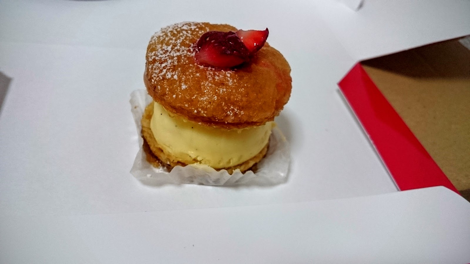 草莓卡士達焦糖泡芙,180日圓,其實不太確定名稱,但吃起來就是這種感覺XD 有點綴草莓果肉的上下的軟脆泡芙體有泡過焦糖的感覺,中間卡士達裡面還有草莓醬,可以說是一個酸甜酸甜的組合體,好吃!
