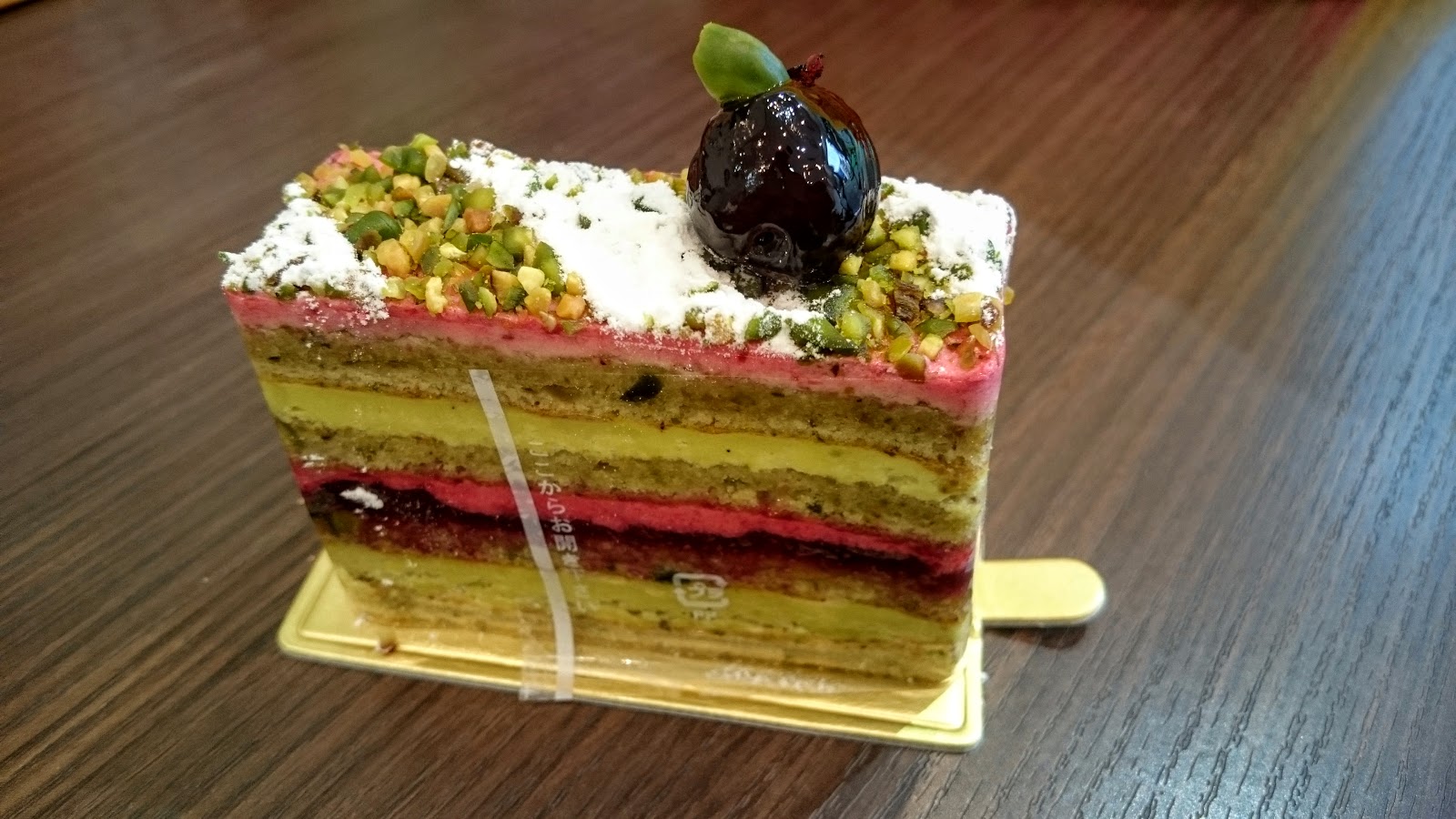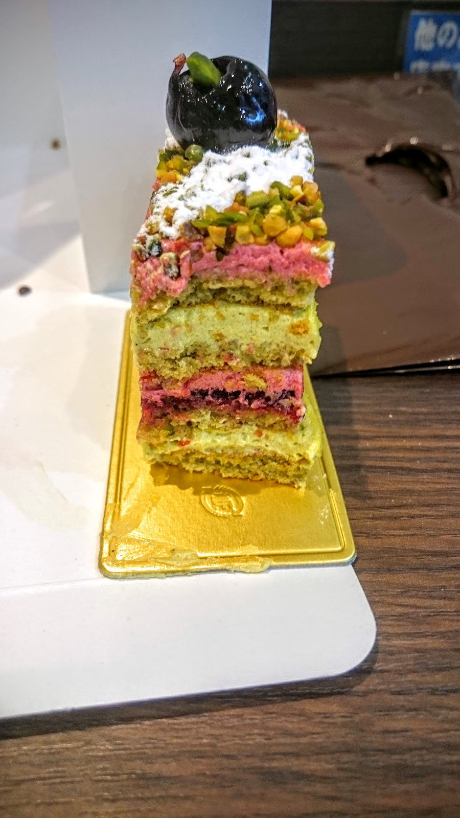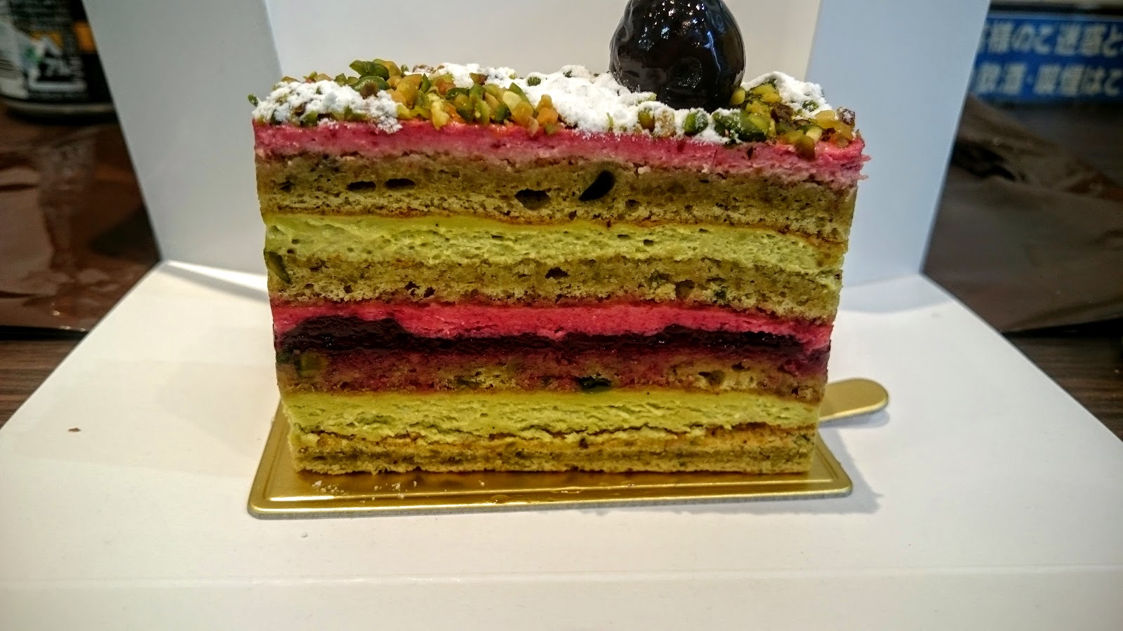 グリオット ピスターシュ ,開心果&櫻桃巧克力,非常多層,視覺效果很棒,有直接撒上去的開心果,也有開心果的cream,搭配下層櫻桃的cream,相性超高,非常搭,口感非常協調,同時能有櫻桃也能有開心果的感覺,甜度也適中,是三個蛋糕裡最令人驚豔的。