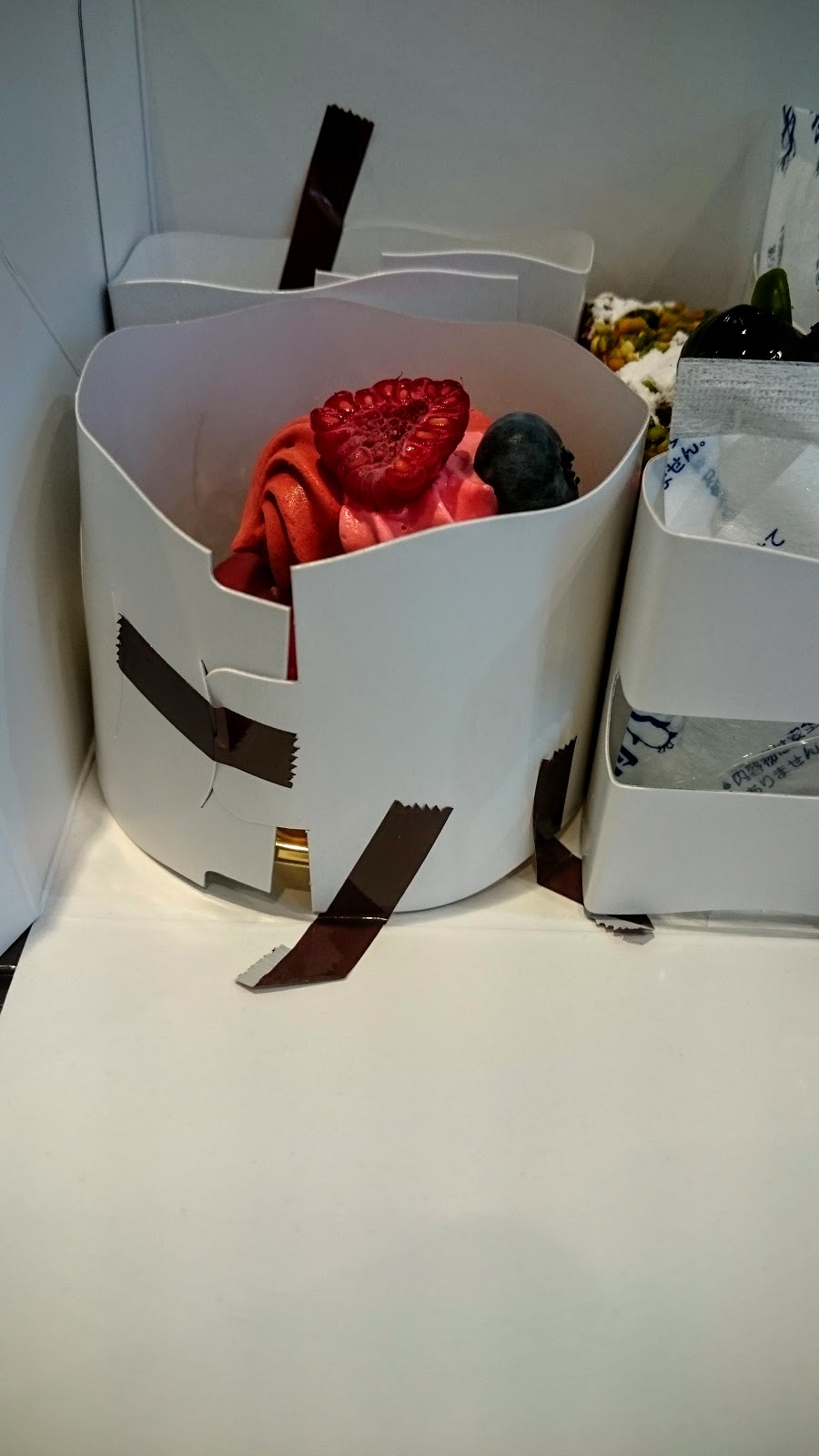 貼得很用心,每個蛋糕起碼貼六七個膠帶來固定,超牢固,過了兩個小時還能像剛拿出來一樣完整。