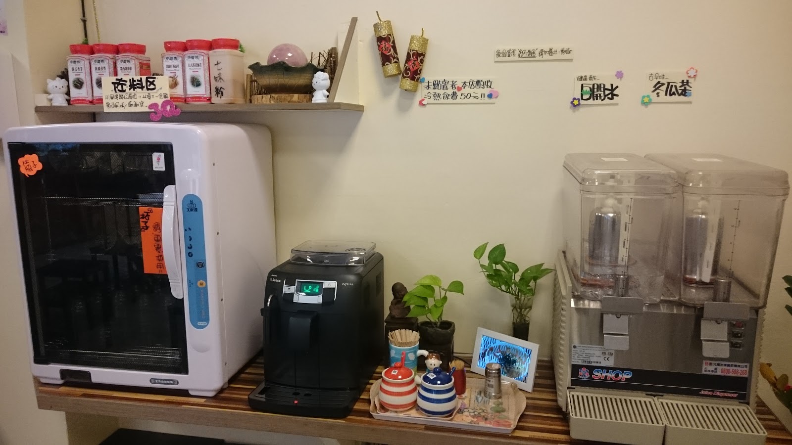 有烘碗機殺菌過的餐具可拿,也有白開水、冬瓜茶可自取,還有一台免費現磨咖啡機,偏苦。