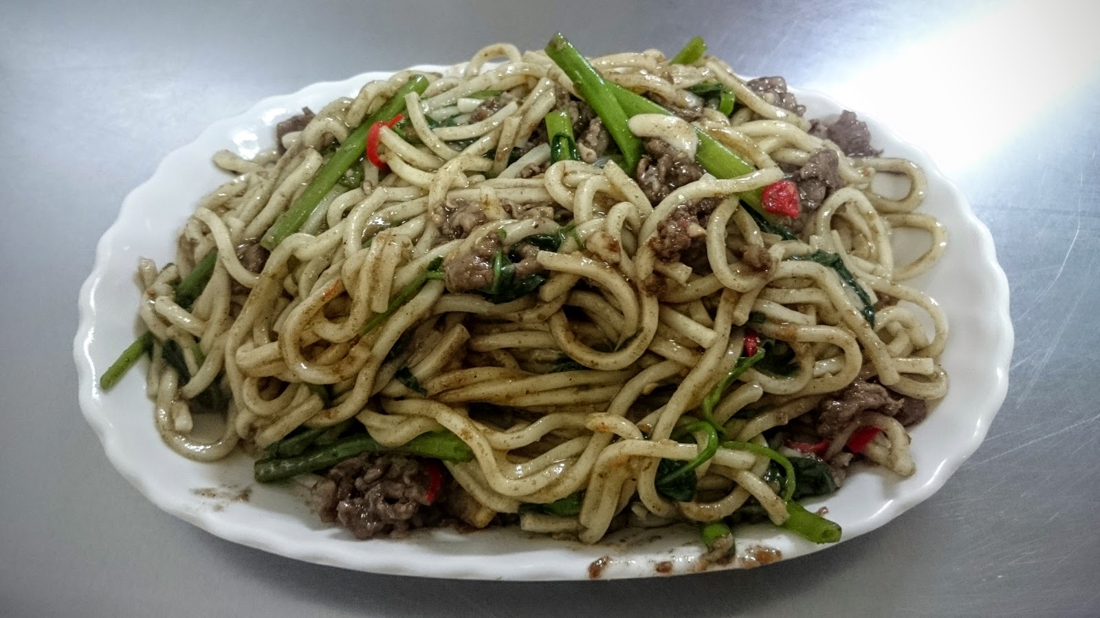 羊肉炒麵,60元,很大一盤,空心菜、羊肉放得不少,沙茶調味,不會太重口,很能一口一接一口。