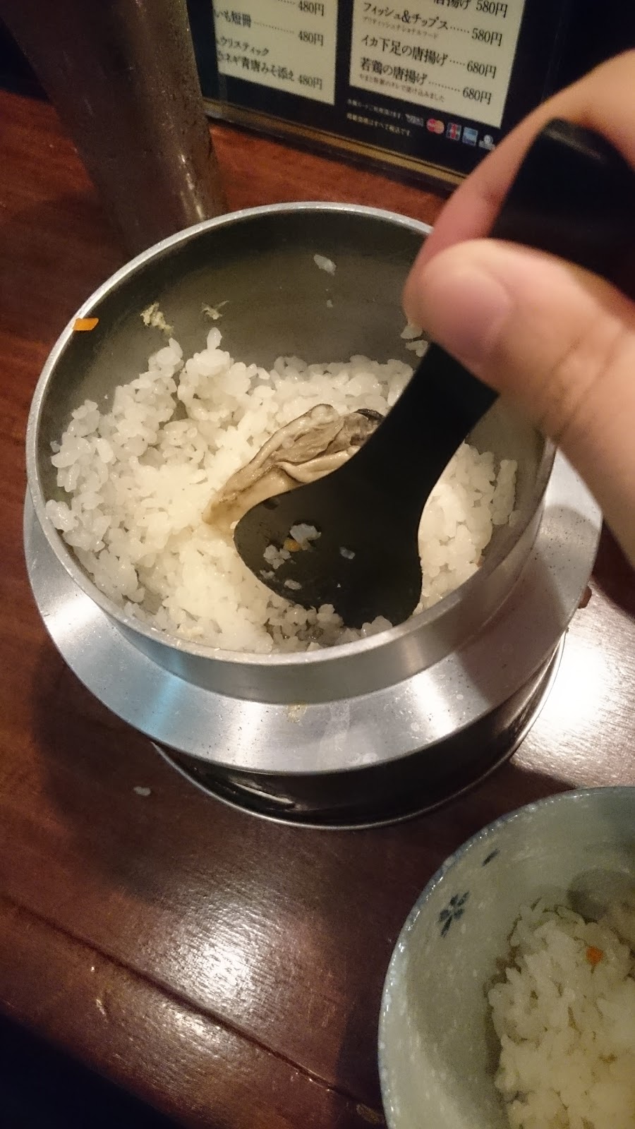 牡蠣釜飯,單點1080日圓,要等一段時間,上面放了三顆飽滿的牡蠣,撒了一點點的配料,下面都是白飯,但倒是意想不到的美味,飯都吸了牡蠣的鮮美,雖然頗多飯,但一個人可以輕鬆地吃下一整份,非常地引人食慾,好吃!