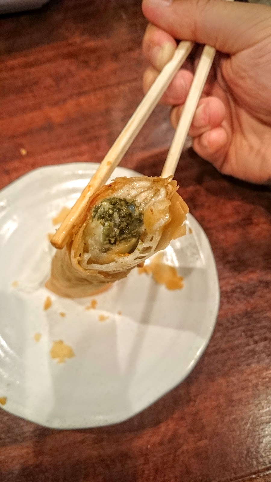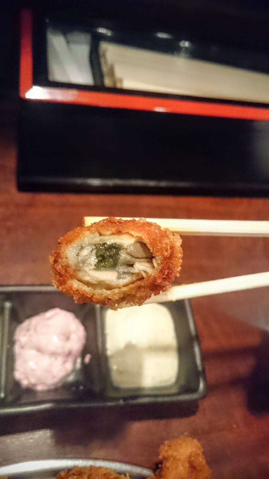 牡蠣春捲,單點880日圓,也有包完整一顆的牡蠣,極燙口、酥脆,餡料的組合搭配很好,不會覺得哪個食材特別突出。