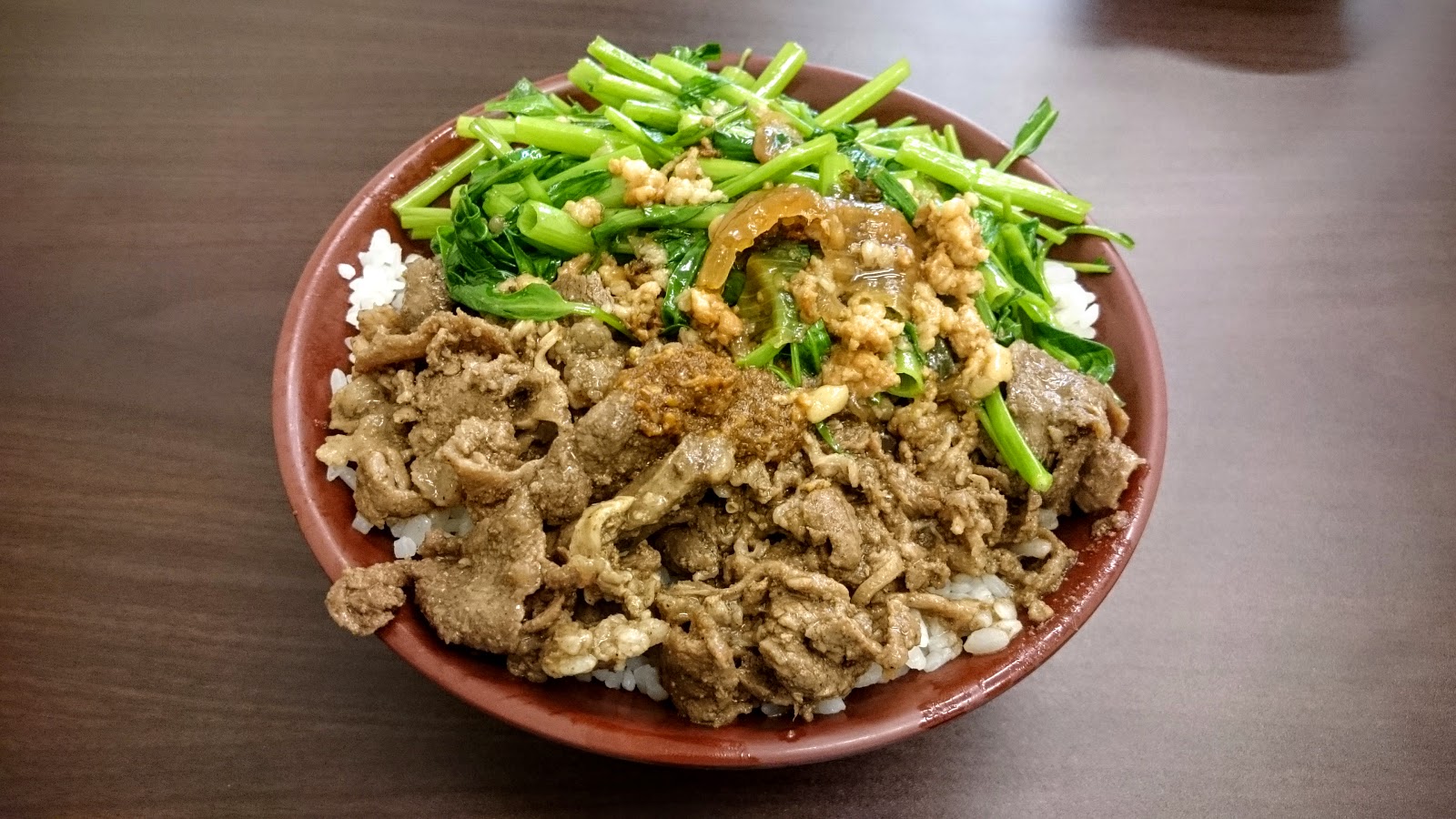 羊肉蓋飯(正常),55元,滿滿的羊肉和滿滿的空心菜,營養都顧到了,下面是滿滿的飯,完全沒有空心,羊肉本身滿軟嫩,不過羊味明顯,配沙茶吃很下飯,空心菜份量應該也是外面小吃店30元的份量,給的很夠,上面有淋滷肉,也是不差。