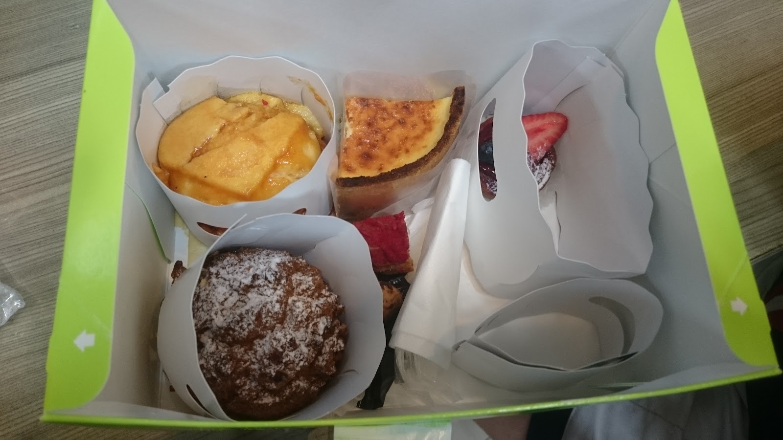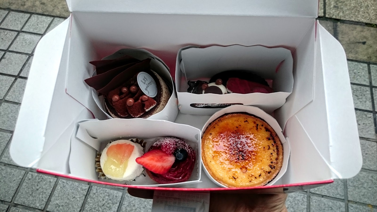 剩下兩個大的帶回旅館吃,左上角提拉迷蘇,酒味重卻不搶戲,入口即化,像是小巧克力蛋糕的提拉米蘇加強版,右下角焦糖布丁過了數小時沒冰表面焦糖略有融化,但和布丁體的搭配還是非常錦上添花。