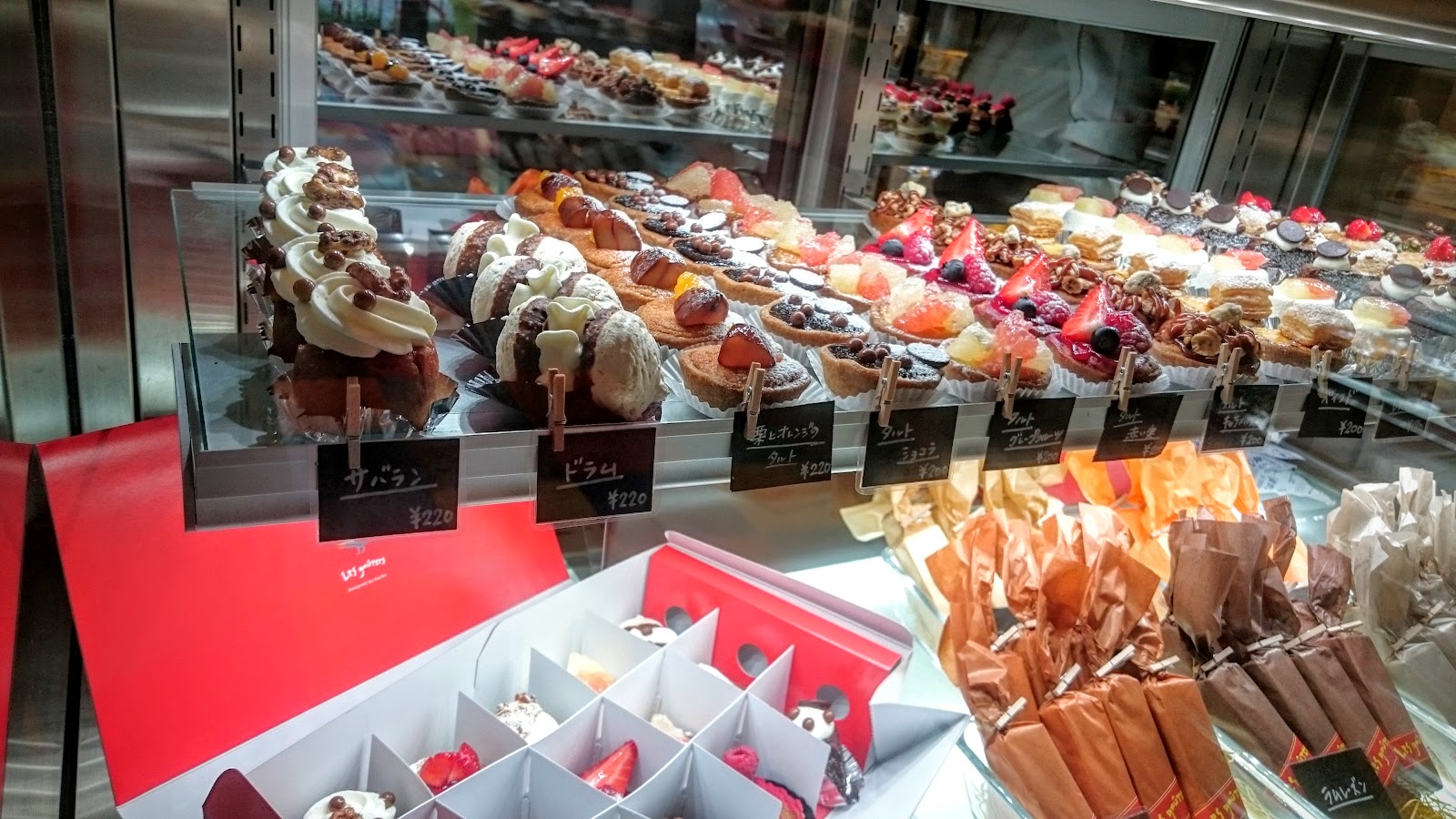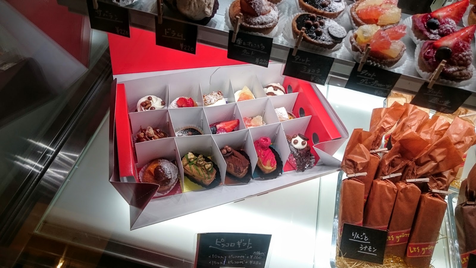 左邊靠近櫃檯的,都是精緻小巧的一口蛋糕,算是右邊大塊的迷你版,價位大概都是兩百日圓上下,有派類塔類也有慕斯類,陸續都有日本人一次來買十五個,就能有像下面一樣精緻的小禮盒。